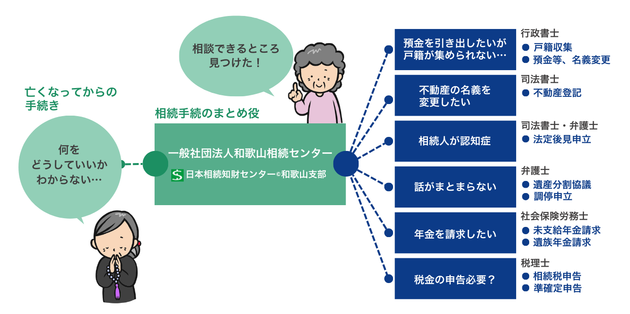 「相続」は一生にそう何度も経験することではありません。お客様の相続に関するあらゆる心配や不安の相談に応じるのが、当センターの役割です。お客様の状況を相談員が丁寧にお聞きし、必要に応じて税理士・弁護士・司法書士・社会保険労務士・行政書士や、土地家屋調査士・不動産鑑定士などの専門家とお客様をお繋ぎします。ワンストップサービスでお客様をサポートいたします。